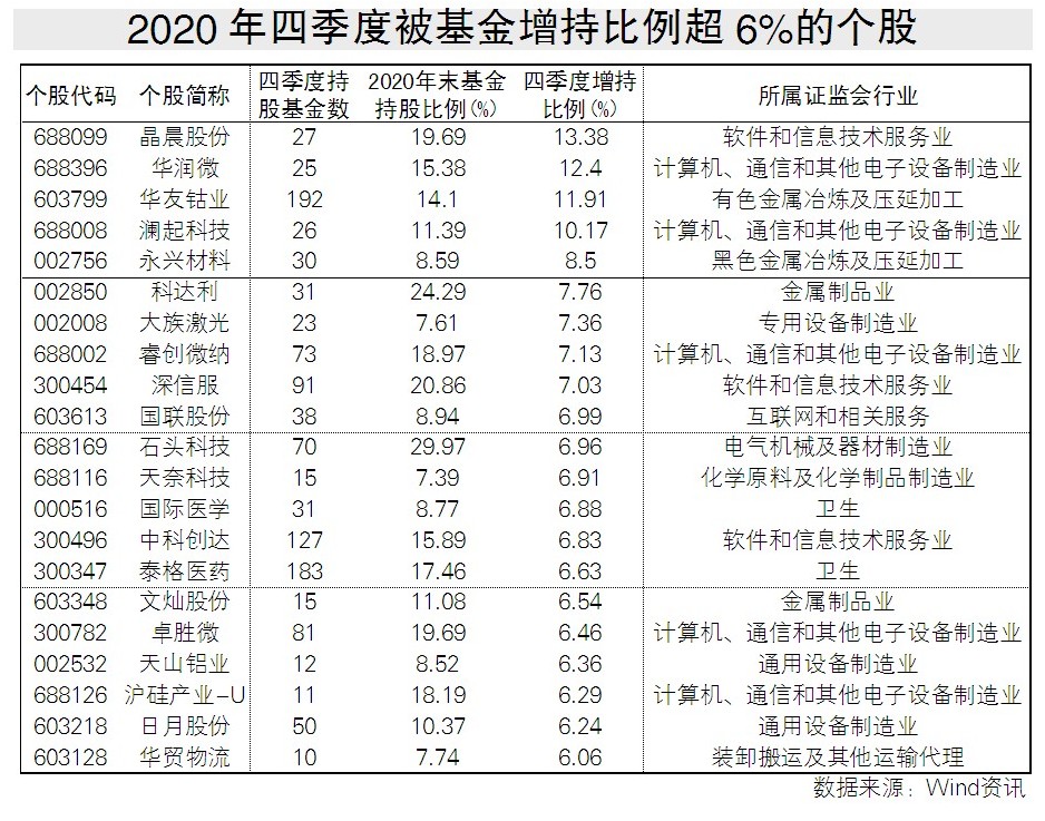 記者根據Wind數據統計發現,截至2020年四季度末,有21只個股的基金持有比例相較三季度出現了較大幅度的整體提升,其中9只個股被基金增持的比例在7%以上,它們分別是晶晨股份、華潤微、華友鈷業、瀾起科技、永興材料、科達利、大族激光、睿創微納和深信服,晶晨股份的基金持股比例從三季度末的 6.31%提高到了四季度末的19.69%,增幅最大。(見表)