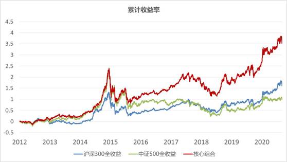 對于核心組合,我們在華寶基金旗下的眾多指數(shù)產(chǎn)品中,從高盈利、高成長、低估值三個維度,分別挑選了一只最能夠體現(xiàn)華寶策略指數(shù)思想理念,具備中長期配置價值的優(yōu)質(zhì)指數(shù)產(chǎn)品,構建了一個風格分散、攻守兼?zhèn)涞暮诵幕鸾M合。其中,盈利維度挑選的是專注于高盈利能力和高盈利質(zhì)量的上市公司的消費龍頭LOF(501090),成長維度挑選的是專注于信息科技和生物科技兩條高成長性賽道中龍頭企業(yè)的科技ETF(515000),低估值維度挑選的是紅利基金(501029)。我們用這三只基金跟蹤的全收益指數(shù)來分析一下這個核心組合的表現(xiàn)。從歷史表現(xiàn)看,我們構建的核心組合2012年7月至2021年2月獲得了年化19.0%的回報率。由于核心組合在風格上相當分散,單獨看每一年,組合的表現(xiàn)相對于滬深300指數(shù)和中證500指數(shù)(目前評價基金表現(xiàn)時最常使用的兩個寬基指數(shù))并不算非常的亮眼,但是長期累計的投資回報和風險調(diào)整后的收益率卻大幅優(yōu)于市場主流指數(shù)的表現(xiàn)。這樣的表現(xiàn)一方面說明我們挑選的指數(shù)產(chǎn)品的選股策略,的確挑選出了更加優(yōu)質(zhì)的上市公司,另一方面也展現(xiàn)了風格分散的優(yōu)勢。在風格不斷變化的市場環(huán)境中,核心組合的表現(xiàn)并沒有受到明顯的影響。在歷史上的大部分的年份中,核心組合的表現(xiàn)都優(yōu)于主流寬基指數(shù)。