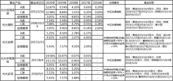 重要提示:黃波2019/6加入光大保德信基金,2019/10至今管理光大中高等級、光大安祺、光大增利、光大信用添益、光大多策略精選18個月;2019/11-2020/12管理光多策略智選18個月,2020/1至今管理光大欣鑫、光大睿鑫,2020/10至今管理光大安澤、2020/12至今管理光大保德信安瑞一年。以下數據來自基金定期報告,截至2020.12.31。光大安瑞一年成立于2020/12/22,目前處于6個月建倉期內,相關業績不予展示。