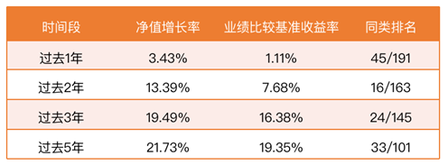③ 該基金在過去1年、2年、3年、5年等不同的時間段,均取得了超越業績基準的收益率回報,并且始終在同類基金中排名前1/3,相對基準和同類平均超額收益明顯。