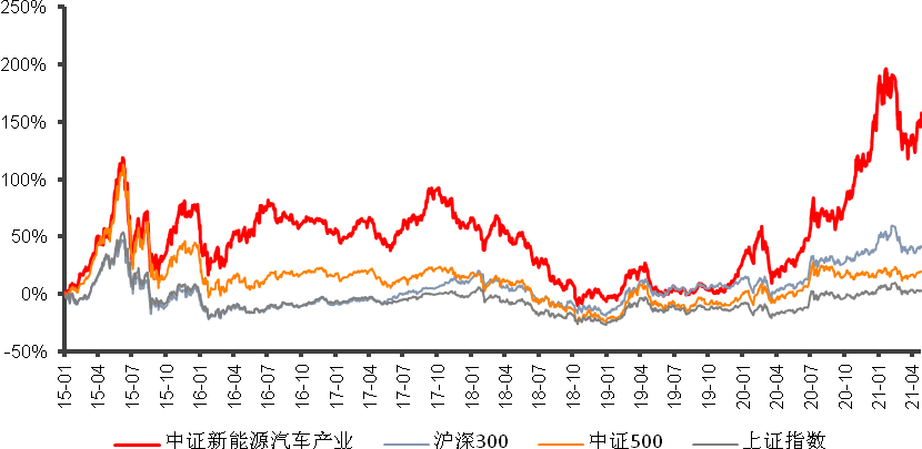 從過往表現看,中證新能源汽車產業指數自2014年12月31日基期以來,截至2021年4月30日,累計漲幅165.46%,長期收益高于主流寬基指數。