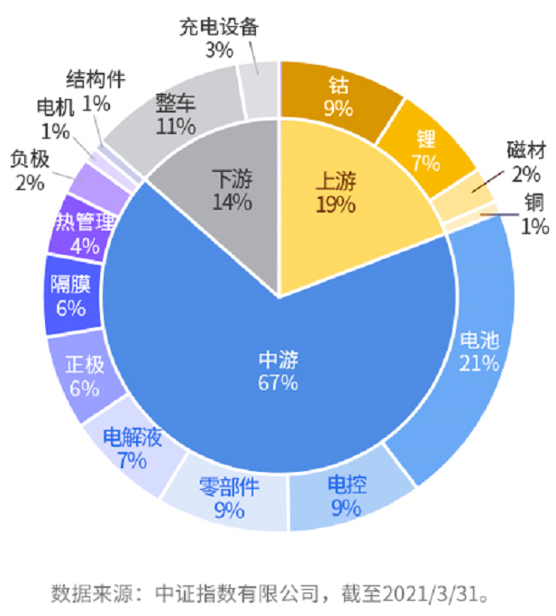 從產業鏈配置角度來看,指數既全面覆蓋新能源汽車上、中、下游全產業鏈,又重點突出中游動力電池領域。截至2021年1季度末,產業鏈上游的鈷、鋰、磁材、銅等占比19%,中游的電池、電控、零部件、電解液、正極等占比67%,下游的整車、充電設備占比14%,充分體現出上游反映資源稟賦、中游反映技術進步、下游反映消費需求的產業鏈投資邏輯。
