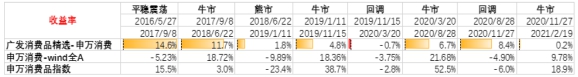 此外,除了能較好地控制回撤,李琛管理的組合也獲得了良好的超額收益。在統計的8個行情區間段內,除了在2020年受到疫情影響超額收益為負之外,廣發消費品精選在其他階段都取得了超額收益。