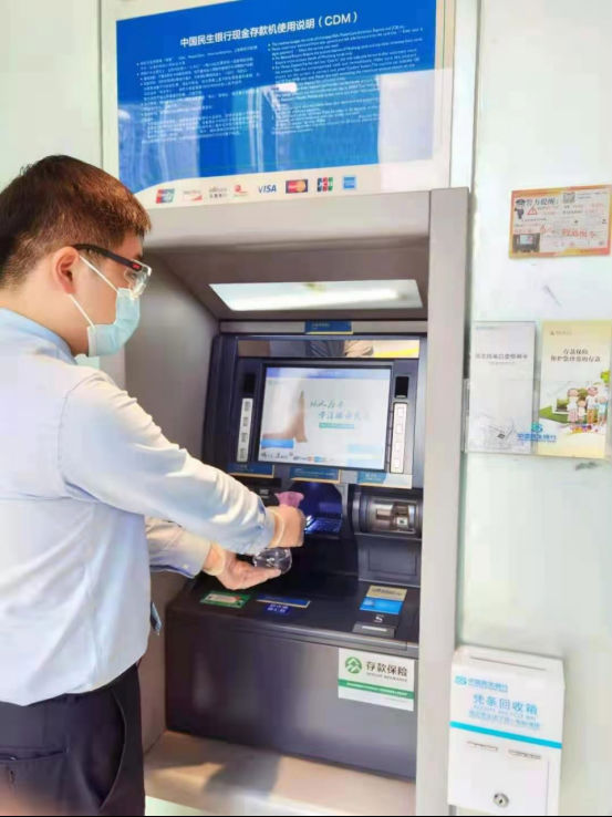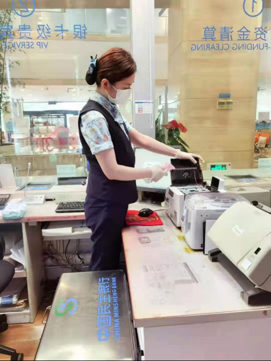 嚴(yán)格落實(shí)營(yíng)業(yè)網(wǎng)點(diǎn)現(xiàn)金業(yè)務(wù)防控各項(xiàng)措施。柜面和自助設(shè)備付出現(xiàn)金使用原封新券或已消毒現(xiàn)金。營(yíng)業(yè)網(wǎng)點(diǎn)每日對(duì)現(xiàn)金處理機(jī)具、柜面、工作臺(tái)、鍵盤、鼠標(biāo)、款箱、款包等進(jìn)行擦拭。安排人員每日分時(shí)段對(duì)廳堂進(jìn)行消毒操作,保障環(huán)境安全。進(jìn)入廳堂的客戶均需佩戴口罩,查驗(yàn)健康碼、進(jìn)行體溫測(cè)量并登記個(gè)人信息,對(duì)未佩戴口罩的客戶提供一次性防護(hù)口罩。等候區(qū)座椅隔開擺放,自助區(qū)域設(shè)置一米線,避免客戶聚集。高頻率對(duì)自助設(shè)備場(chǎng)地以及門柜、屏幕、按鈕、密碼鍵盤、存鈔口等人員頻繁接觸部位進(jìn)行全面消毒。