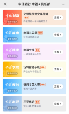 中信銀行“幸福+”是國內著名的老年金融服務品牌,包括老有所養“幸福+財富”、老有所醫“幸福+健康”、老有所享“幸福+優惠”、老有所學“幸福+學院”、老有所游“幸福+出游”、老有所樂“幸福+舞臺”六大服務板塊,打造了慢病管理、電話家庭醫生、幸福三公里、老年課程、幸福專線、“幸福家爸媽才藝活動”等多項深受老年客戶喜愛的爆款服務和活動。