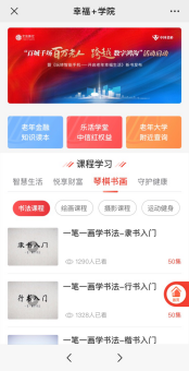中信銀行專門給老年朋友準備的“課程學習”一共有智能生活、悅享財富、琴棋書畫和守護健康四大板塊,都是老年朋友需要和關心的內容,總課程2000余節,總時長超過1.8萬分鐘。