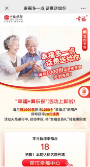 在“中信銀行”微信公眾號搜索“幸福”,點擊進入“幸福+”俱樂部,用手機號碼注冊成為會員即可學習,同時,記者還發現,“幸福+”俱樂部會員通過簽到、學習、打卡、分享,還可以積累“幸福點”,每月幸福點達到一定標準還可以兌換手機話費等權益。