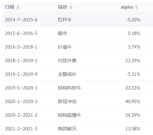 根據貓頭鷹捕基能手的系統分析,在不同的市場階段,程琨都取得了較為穩定的超指數alpha表現。