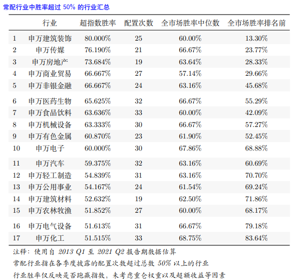 從數據上可以看到,在17個常配的申萬一級行業上,他表現出了穩定的超行業指數高勝率。