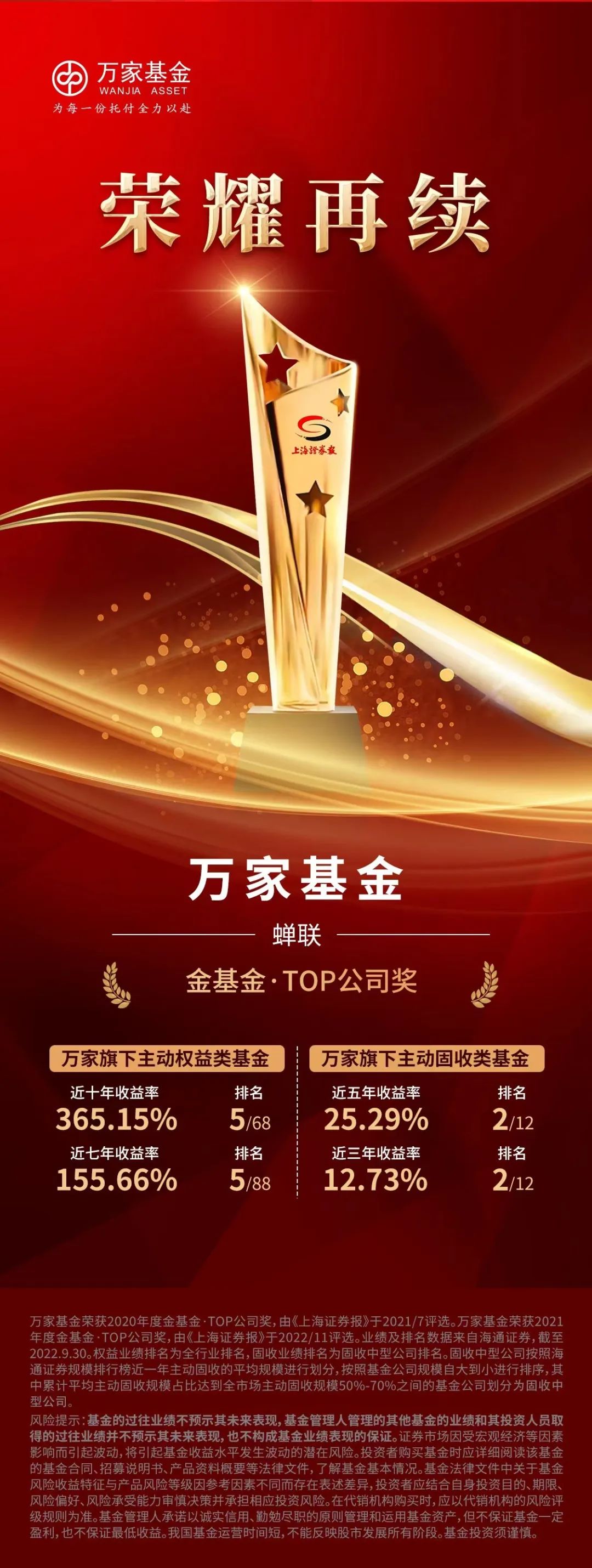 11月14日,由《上海證券報》評選的第十九屆中國基金業“金基金獎”榜單正式揭曉,憑借強大的綜合實力和優異的長期業績,萬家基金再次捧得該評選至高榮譽——“金基金·TOP公司獎”,這已是萬家基金攬獲的第3座“TOP公司獎”獎杯。