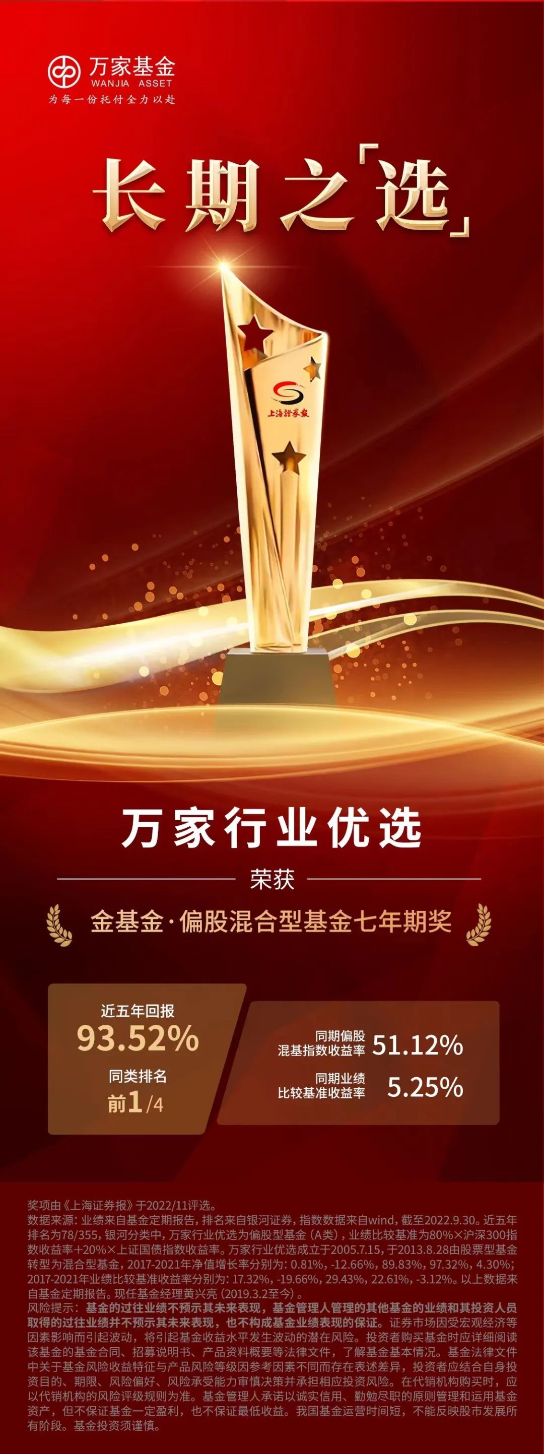 在本次評選中,公司旗下多支產品亦獲殊榮——萬家行業優選榮獲“金基金·偏股混合型基金七年期獎”、萬家鑫璟榮獲“金基金·偏債混合型基金五年期獎”。