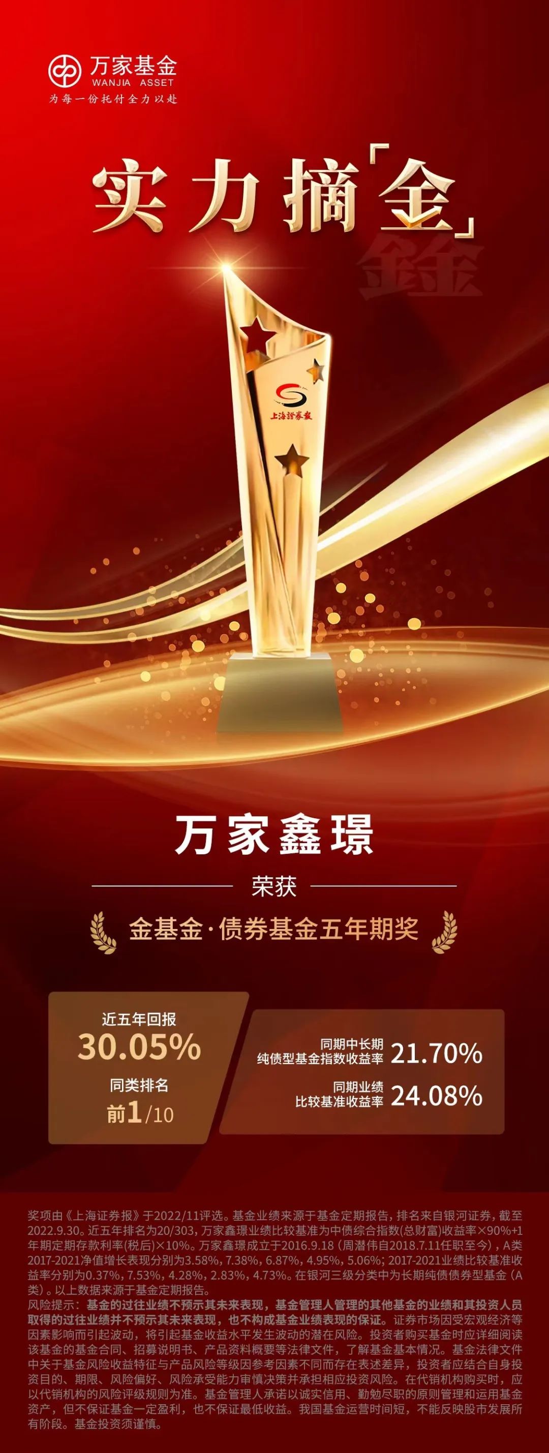 作為行業內極具口碑和影響力的一大獎項,“金基金”獎是由中國基金業協會授權基金評獎機構——上海證券報社,并由專業基金評價機構中國銀河證券、上海證券、晨星資訊以及MSCI提供數據和研究支持,共同推出的基金業專業獎項,至今已走過十九年歷程。一舉斬獲“金基金”3項重量級大獎,充分體現業界對萬家基金長期投資能力的認可,更彰顯了公司高質量發展之下的綜合實力。