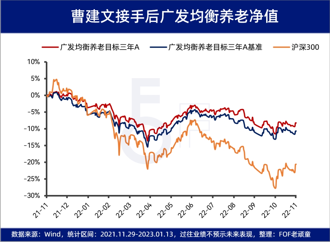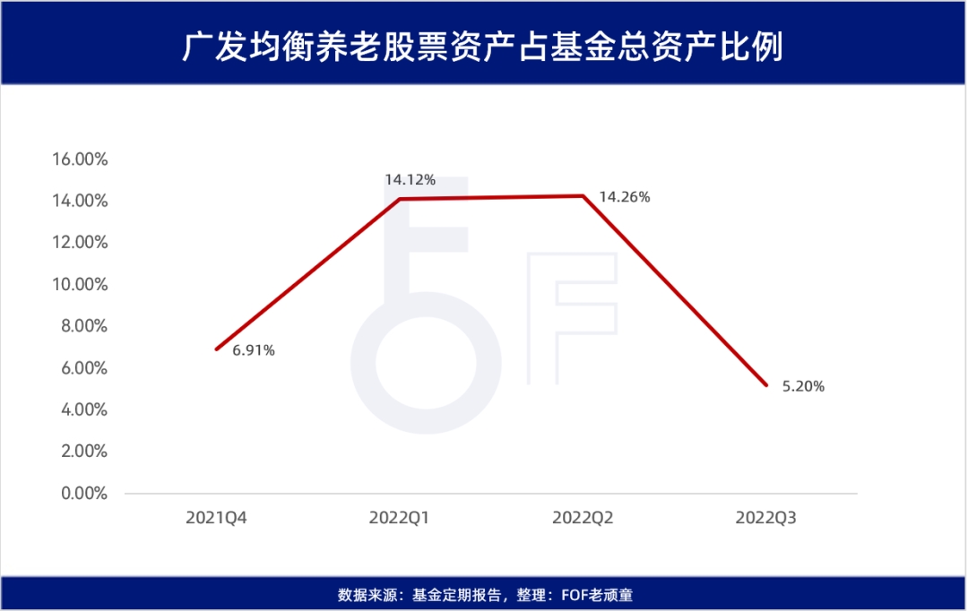 曹建文是市場上少有的,涉及多個維度,能力圈廣泛,比較稀缺的一類。他擁有近10年的養老金管理與FOF投資經驗。做過量化分析師、專戶股票投資,同時管理過相對收益和絕對收益的產品。豐富的多資產管理經歷,讓他同時具備了宏觀、權益、衍生品等多維度的能力。而且不論是相對收益的產品還是絕對收益的產品,在曹建文管理期間都獲得了比較高的超額收益。多年的磨煉,并非簡單的領域疊加,而是個人投資框架、體系在過往背景之下建立和不斷進階的過程,孕育了他穩健的投資風格。這樣的經歷為他后來管理公募FOF,提供了較為豐富的實戰經驗。03產品操作與投資理念的適配性豐富的養老金管理經驗、多資產管理背景和穩健的投資理念,最終還需要反映在產品的具體配置上。我們可以看看曹建文在廣發均衡養老上是如何體現他穩定性強的特點的。穩定性強的重要標準之一,是必須具有優秀的風險控制能力。曹建文的風險控制主要在于三個方面。第一,從宏觀角度控制風險。廣發均衡養老在2022年二季度市場上漲時,提高了權益資產配置比例,而在2022年三季度市場下跌時,配置了價值型基金作為防御。自上而下的倉位調整是基金經理資產配置能力的體現,在2021年年報的時候,廣發均衡養老的股票倉位是6.91%,而到了2022年一季報的時候,股票倉位提高到了14.12%。在2022年三季報,我們看到股票倉位又下降到了5.20%。