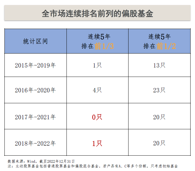 他們的統(tǒng)計結(jié)果顯示,連續(xù)三年排在行業(yè)前1/3的基金,在其后兩年(即連續(xù)五年)仍能排名前1/3的概率非常低,低到只有幾只。