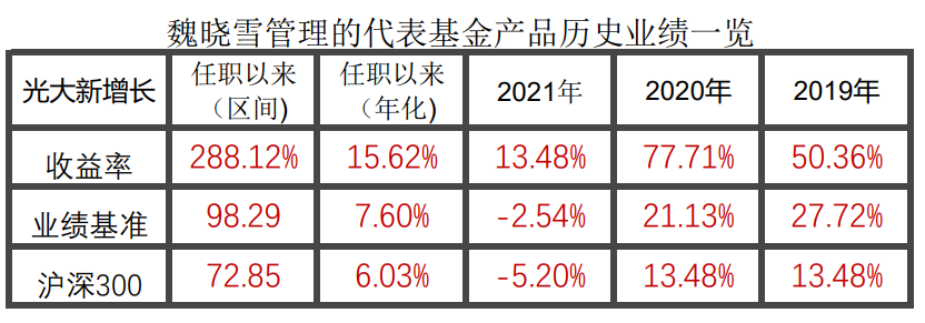 數(shù)據(jù)顯示,她管理時間最長的代表性基金產(chǎn)品(“光大新增長”)連續(xù)6年居于同類前50%分位,年化收益率15%,任職的近10年里累計收益率接近300%,她也因此躋身有著“長跑健將”之稱的“雙十”基金經(jīng)理之列。