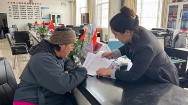 瑪沁縣政務服務大廳醫保窗口審核員中國人壽壽險瑪沁支公司員工才忠吉經常為拉毛杰做審核,她說,今年第一次看到拉毛杰自己拿著報銷資料到窗口時,心中為他的病情好轉感到高興。