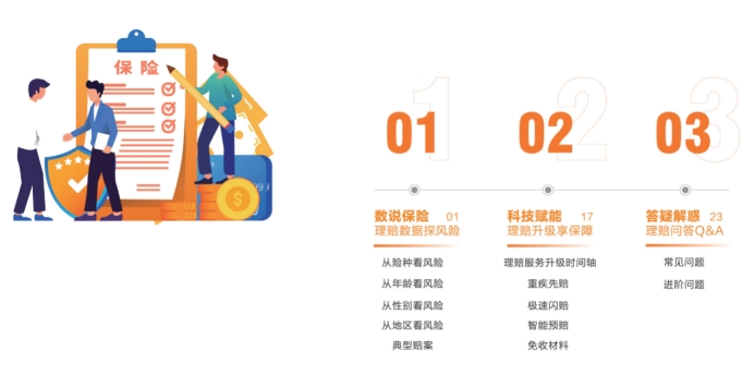 《個人壽險理賠服務指南》分為“科技賦能 ——理賠升級享保障”、“數說保險——理賠數據探風險” 、“答疑解惑——理賠問答q&a ”三個篇章,探究風險保障,為客戶提供有溫度的金融服務。