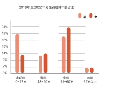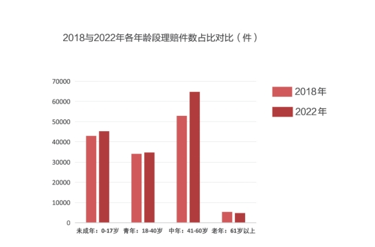 對比2018年及2022年賠付數據,41-60歲人群賠付件數占比明顯上漲,理賠人群整體呈年輕化趨勢。
