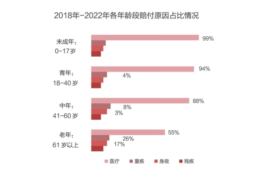 從賠付原因來看,任何年齡段賠付原因占比都是醫療>重疾>身故>殘疾。預算有限時,應優先考慮小投入大保障的醫療險。