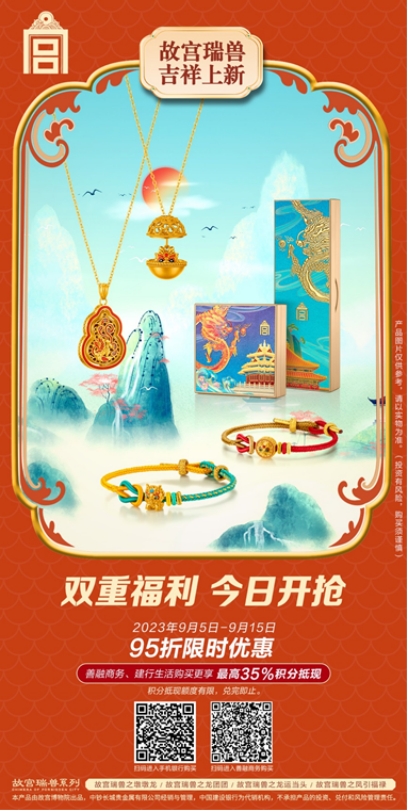 據悉,“故宮瑞獸”第5季系列新品已于2023年9月5日在建行全國各網點發售,9月5日至9月15日期間購買,限時可享9.5折優惠,還有更多福利放送。