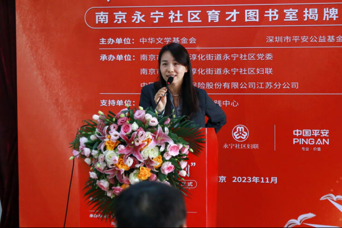 永寧社區黨委書記周彩培和作家朱婧女士,一同為永寧社區育才圖書室揭牌;中國平安江蘇地區品牌總監徐嘉懌向永寧社區贈書。