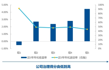 Nature Communications在2020年發布的研究報告顯示,ESG因子有望給指數帶來超額收益。根據歷史數據進行回測,按公司治理得分對全部A股進行分組,結果顯示,平均而言,公司治理得分越高的股票分組收益率越高、波動率越低。