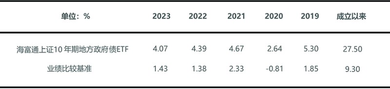 業績數據來源:基金定期報告,截至2023年12月31日。海富通上證10年期地方政府債ETF歷任基金經理:陳軼平(2018/10-2023/12)、陸叢凡(2019/7-2022/7)、唐靈兒(2022/7至今)、陶斐然(2023/6至今)。