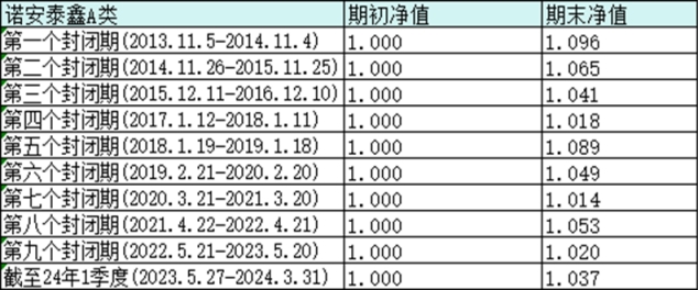 作為一只成立于2013年11月5日的老牌基金,諾安泰鑫一年定期開放債券A的“長跑”能力也值得關(guān)注。據(jù)托管行復(fù)核數(shù)據(jù)顯示,截至2024年3月31日,該基金自成立以來凈值增長率達(dá)61.64%,對比同期業(yè)績比較基準(zhǔn)30.86%的漲幅,實現(xiàn)了30.78%的超額收益。并且,在已經(jīng)結(jié)束的9個封閉期內(nèi)基金凈值表現(xiàn)也相當(dāng)亮眼。