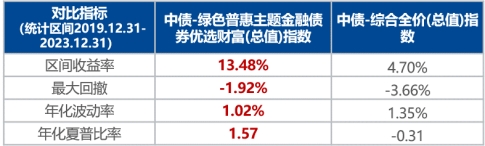 據Wind數據,從中債綠色普惠主題金融債券優選指數的基日2019年12月31日起,截至2023年12月31日,中債綠色普惠主題金融債券優選指數的區間漲幅高達13.48%,遠高于中債-綜合全價指數4.70%的漲幅,同期最大回撤、年化波動率、年化夏普比率等指標也明顯更優。