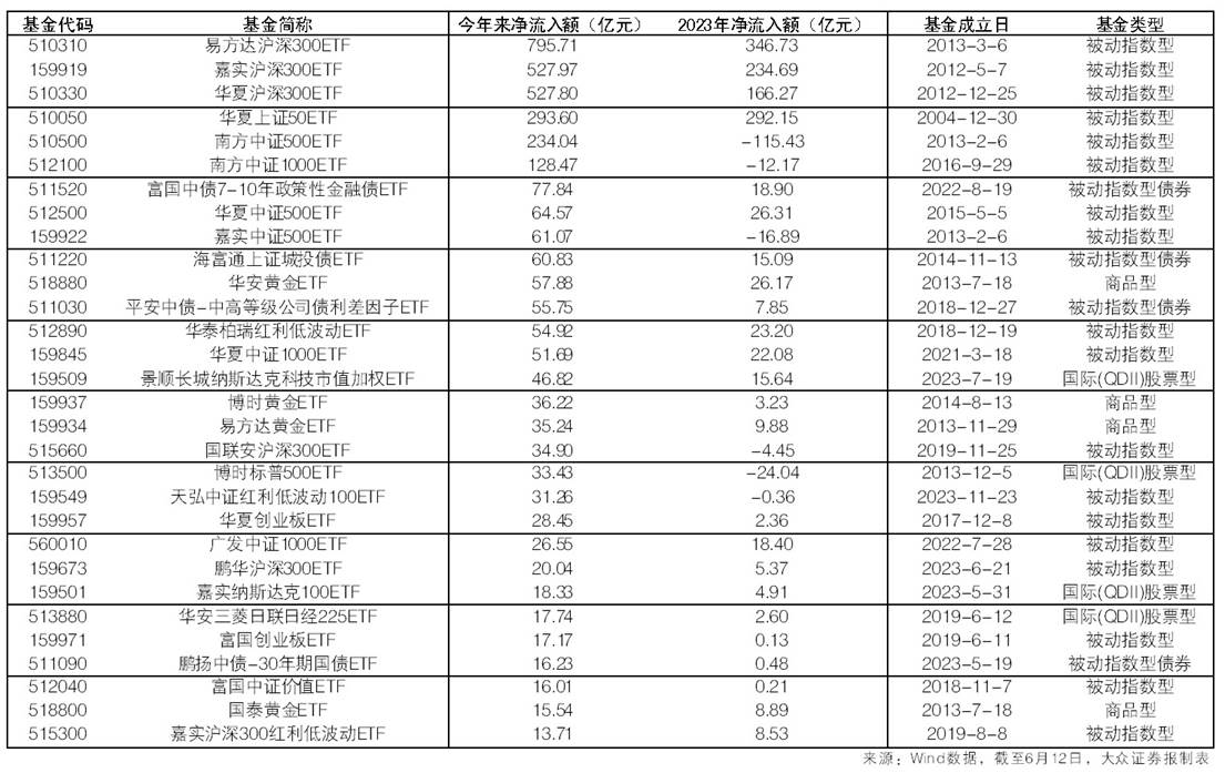 記者根據Wind數據統計發現,截至6月12日,今年以來有314只基金的場內資金凈流入額已超過去年全年,其中凈流入額最大的是三只對標滬深300指數的ETF基金,易方達滬深300ETF年內資金凈流入795.71億元,嘉實滬深300ETF凈流入527.97億元,華夏滬深300ETF凈流入527.8億元,而去年全年這三只基金的資金凈流入額不到上述金額的一半。此外,華夏上證50ETF、南方中證500ETF、南方中證1000ETF的年內資金凈流入額均超過100億元(見表)。