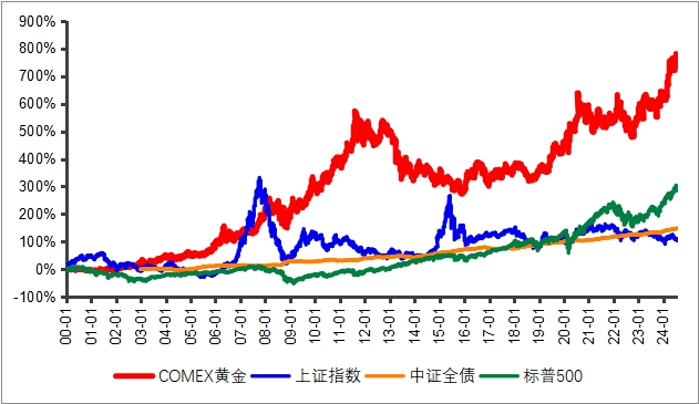 自2000年以來,COMEX黃金漲幅高達725.48%,顯著跑贏上證指數(111.61%)、中證全債指數(148.86%)和標普500指數(271.86%)的同期表現。這樣的收益能力在資產荒、低利率的環境下,無疑顯現出較好的投資吸引力,是值得投資者長期拿的品種之一。(數據來源:WIND,截至2024年7月29日)