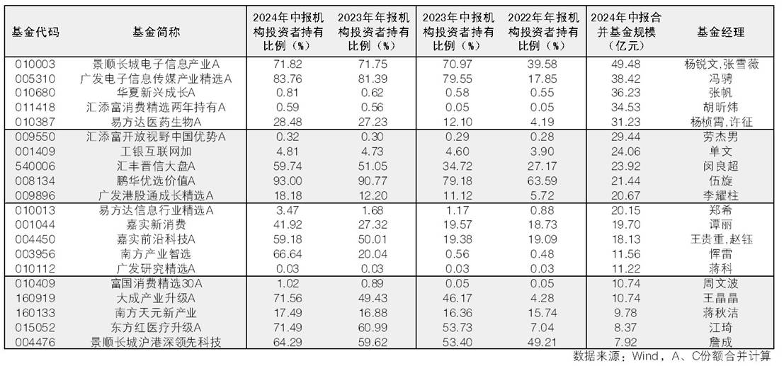 哪些股票型基金被機構投資者增持?根據Wind數據統計,記者發現2022年末到2024年中,機構連續增持的普通股票型基金有63只,其中,機構持有比例最高的是鵬華優選價值和永贏卓越臻選,今年上半年末兩只基金被機構投資者持有比例均超過90%。上述63只普通股票型基金中,規模較大的是廣發電子信息傳媒產業精選、景順長城電子信息產業、易方達醫藥生物、華夏新興成長、匯添富消費精選兩年持有,今年上半年末的規模均超過了30億元(見表)。