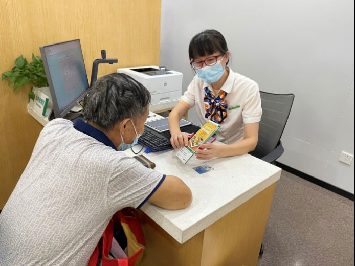 圖:柜面人員為老年客戶介紹保單權益