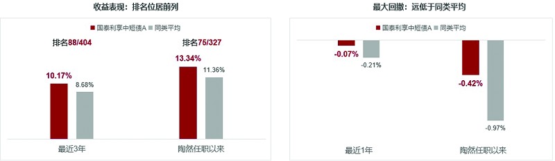 具體來看,國泰利享中短債A作為國泰“利”系列中短債旗艦產品,榮獲銀河證券三年期五星評級、海通證券三年及五年五星評級。基金經理陶然自2020年7月7日管理以來,基金凈值走勢穩健向上,顯著跑贏同期業績比較基準和短期純債平均水平。截至2024年6月末的數據顯示,該產品近3年收益率10.17%,排名同類前25%;該產品風控能力也領先同類,近1年最大回撤-0.07%,在全市場規模超過100億元的34只開放式短債基金中排名第一,近2年、近3年最大回撤僅為-0.30%。