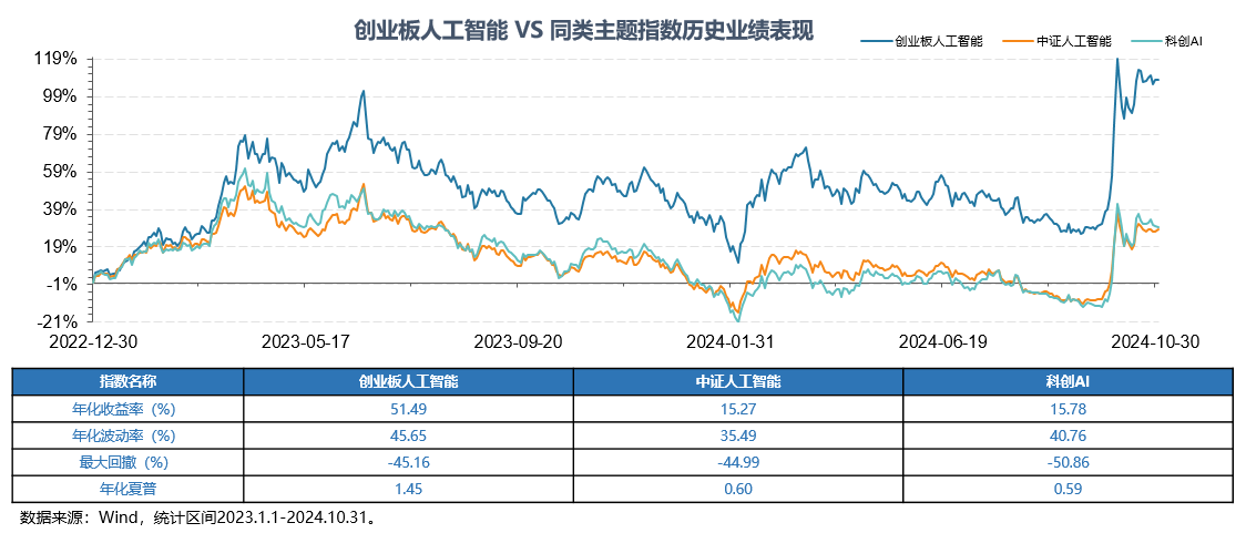 2023年以來,創業板人工智能指數收益顯著跑贏同類主題指數。Wind統計數據顯示,2023.1.1-2024.10.31期間,創業板人工智能指數累計漲幅為108.06%,同期中證人工智能主題指數、科創AI指數累計漲幅分別為28.49%、29.5%。