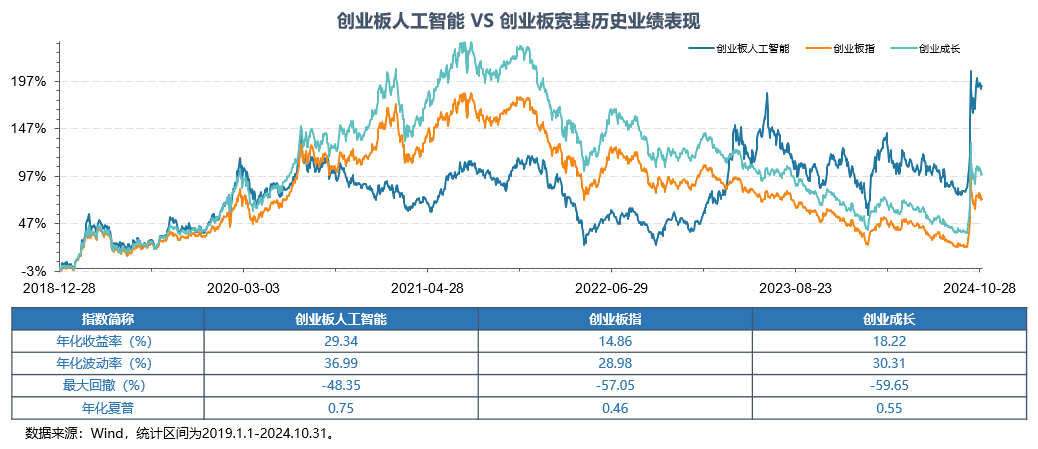 2019年以來,創業板人工智能指數收益亦顯著跑贏創業板寬基指數,且最大回撤相對更小。Wind數據顯示,2019.1.1-2024.10.31期間,創業板人工智能指數累計漲幅為192.13%,同期創業板指、創業成長指數累計漲幅分別為73.08%、99.33%;同期間創業板人工智能指數最大回撤為-48.35%,同期創業板指、創業成長指數最大回撤分別為-57.05%、-59.65%。經過今年以來的階段性調整,截至2024年10月末,創業板人工智能指數市盈率(PE)已位于過去五年51.3%的分位數,處于相對合理區間。
