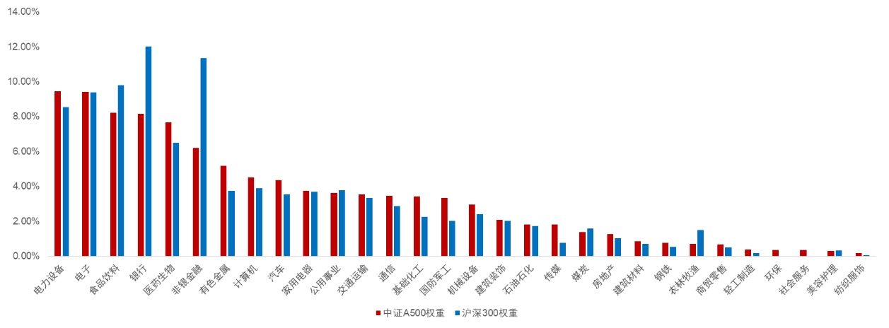 第二,相較傳統(tǒng)寬基指數(shù),中證A500指數(shù)的新經(jīng)濟(jì)含量更高。中證A500指數(shù)相較滬深300指數(shù)顯著超配電力設(shè)備、計(jì)算機(jī)、通信和國防軍工等新質(zhì)生產(chǎn)力方向,降低金融和消費(fèi)等傳統(tǒng)行業(yè)占比,使得指數(shù)能夠全面刻畫經(jīng)濟(jì)發(fā)展結(jié)構(gòu)的變化與產(chǎn)業(yè)的轉(zhuǎn)型升級。