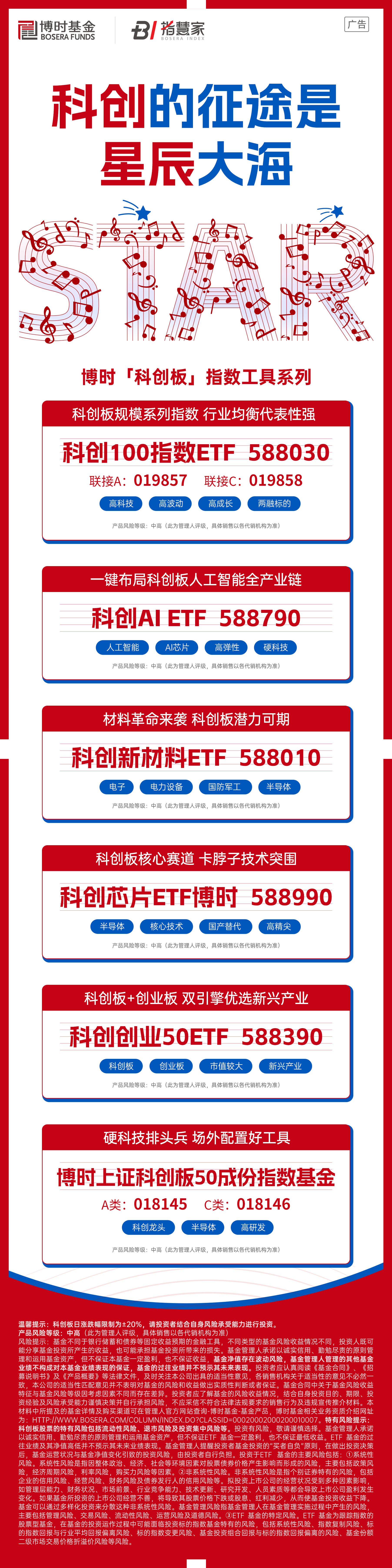 注:博時(shí)科創(chuàng)AI ETF、科創(chuàng)創(chuàng)業(yè)50ETF、科創(chuàng)新材料ETF、科創(chuàng)板50指數(shù)基金、博時(shí)科創(chuàng)100指數(shù)ETF及其聯(lián)接基金、科創(chuàng)板芯片ETF風(fēng)險(xiǎn)等級均為中高(此為管理人評級)。