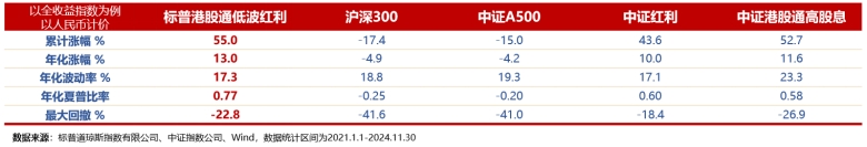 在2021年至2024年11月末反復震蕩的行情期間,標普港股通低波紅利指數亦展現出強勁的韌性與向上彈性。相較于主流寬基指數和同類紅利主題指數,標普港股通低波紅利指數在收益率、波動率、夏普比率、回撤控制等方面均展現可觀的優勢。2021年至2024年11月末期間,該指數累計漲幅為55.0%,顯著領先同期滬深300、中證A500、中證紅利、中證港股通高股息指數-17.4%、-15.0%、43.6%、52.7%的累計漲幅。同期間標普港股通低波紅利指數最大回撤為-22.8%,同期滬深300、中證A500、中證紅利、中證港股通高股息指數最大回撤分別為-41.6%、-41.0%、-18.4%、-26.9%。同期間標普港股通低波紅利指數年化夏普比率為0.77,同期滬深300、中證A500、中證紅利、中證港股通高股息指數年化夏普比率分別為-0.25、-0.20、0.60、-0.58,這顯示該指數風險調整后的收益率相對于主流股債指數亦處于領先水平。