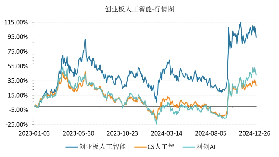 作為A股2025年最主要投資方向之一,人工智能有望繼續(xù)成為市場主線,引領年度行情。對比同類AI主題指數,創(chuàng)業(yè)板人工智能指數的中長期業(yè)績更優(yōu)。據Wind數據統(tǒng)計,截至2024年12月31日,創(chuàng)業(yè)板人工智能指數自2023年以來累計漲幅超過104%,大幅跑贏同類主題指數。