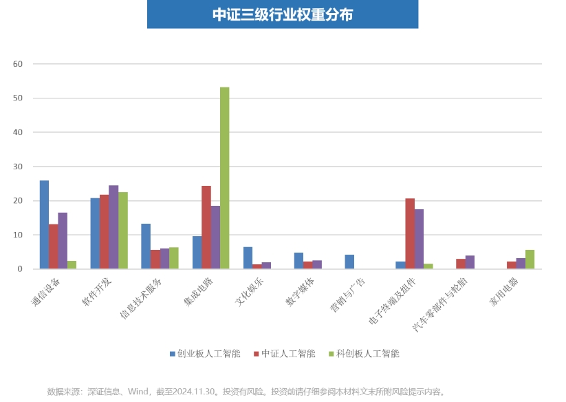 因科創(chuàng)板的獨特定位,大量芯片產業(yè)鏈企業(yè)在科創(chuàng)板上市,科創(chuàng)板的含“芯”量較高。研究科創(chuàng)AI指數發(fā)現(xiàn),其在芯片板塊上有著壓倒性的配置權重。截至2024.11.30,科創(chuàng)AI指數超50%的倉位配置于集成電路行業(yè)。相較之下,創(chuàng)業(yè)板人工智能指數的行業(yè)分布相對均衡,也就是說,芯片板塊的行情冷暖對科創(chuàng)AI指數表現(xiàn)的影響,要遠大于創(chuàng)業(yè)人工智能指數。
