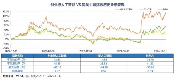 2023年以來,創業板人工智能指數收益顯著跑贏同類主題指數。Wind統計數據顯示,2023.1.1-2025.1.31期間,創業板人工智能指數累計漲幅為107.46%,同期科創AI指數、中證人工智能主題指數累計漲幅分別為55.99%、31.42%。截至2025年1月末,創業板人工智能指數市盈率(PE)在經歷了前期上漲后位于過去五年70.83%的分位數,仍處于相對合理區間。