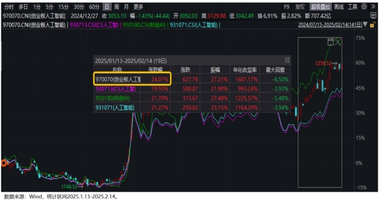 今年以來, AI主題行情已由低點完成一輪“V”型逆轉,創業板人工智能指數再次領銜同類指數反攻。據Wind統計數據顯示,截至2月14日,創業板人工智能指數自本輪AI主題行情低點(1月13日)以來累計反彈24.07%,表現優于同期人工智能、CS人工智、科創AI等AI主題指數,呈現出更強的彈性優勢。