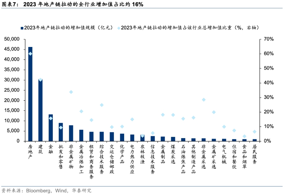 雖然房地產開工量尚未明顯回升,但產業鏈對經濟的影響不容小覷。Wind數據顯示,2021年初以來,中國資產的前向12個月P/E(f12M P/E)走勢與國內30城商品房銷售面積同比增速基本同步。華泰證券通過投入產出大致估算,2023年地產鏈拉動的全行業增加值占比約16%。