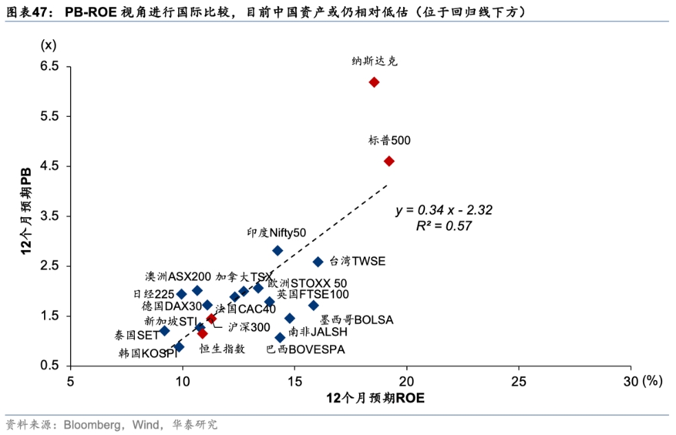 盡管近期中國資產表現強勢,國際比較視角下中國資產或仍相對低估。橫向來看,以PB-ROE視角進行國際比較,目前中國資產在全球主要資產類別中仍處于相對低估水平。華泰證券研究顯示進一步比較中國資產與全球其他新興市場,目前中國資產(以MSCI中國指數衡量)較其他新興市場(以MSCI新興市場除中國指數衡量)或仍有約-7%的折價率。