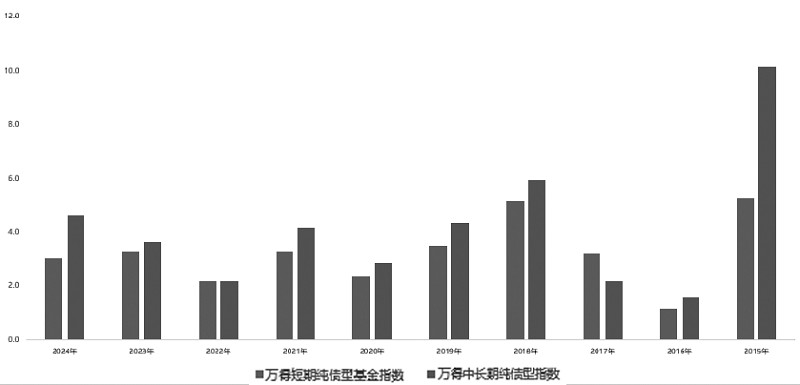 純債基金與股票市場相關性較低,歷史業績相對平穩。回看過往十年間,無論是萬得短期純債基金指數還是萬得中長期純債基金指數,二者均實現“年年正收益”。通過長期持有,投資者有望實現跨越周期的穩健回報。