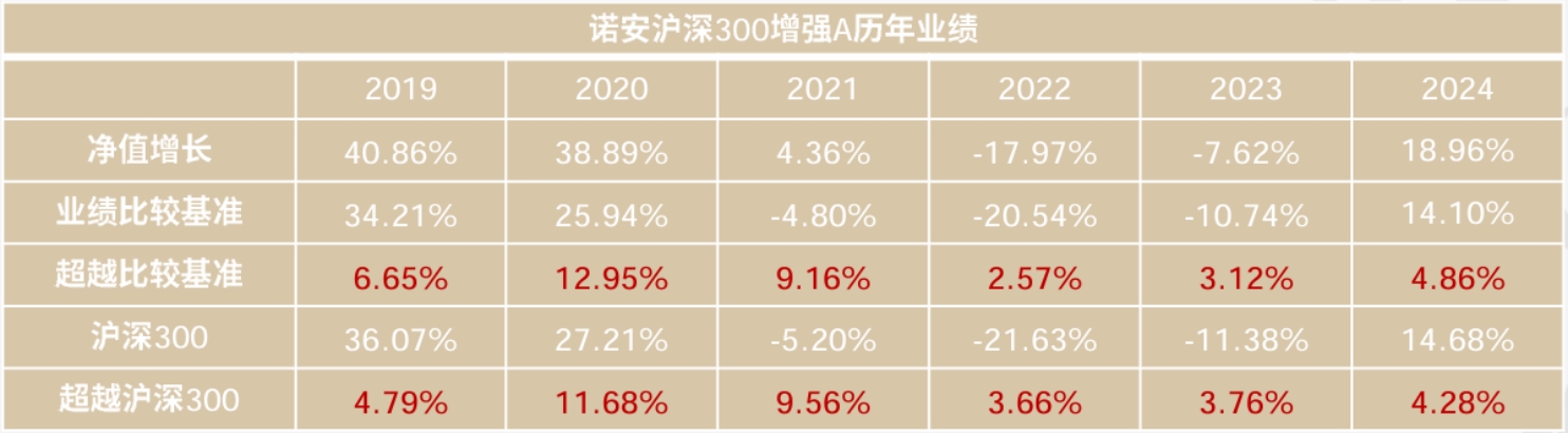 【諾安滬深300指數增強基金】本基金成立于2018.8.22,由原諾安上證新興產業交易型開放式指數證券投資基金聯接基金轉型而來。2018.8.22至2023.6.2,梅律吾擔任基金經理;2019.3.2至2023.9.5,宋德舜擔任基金經理;2023.6.3至今,孔憲政擔任基金經理。自2020.10.28起,本基金分設A、C兩類份額;自2024年1月30日起,本基金設立D份額。A類2020-2024年凈值增長率分別為:38.89%、4.36%、-17.97%、-7.62%、18.96%,同期業績比較基準收益率分別為:25.94%、-4.80%、-20.54%、-10.74%、14.10%;C類2021-2024年凈值增長率分別為:3.97%、-18.30%、-7.98%、18.48%,同期業績比較基準收益率分別為:-4.80%、-20.54%、-10.74%、14.10%;D類2024年凈值增長率為:26.62%,同期業績比較基準收益率為:21.89%。(數據來源:諾安滬深300指數增強型證券投資基金定期報告;本基金的業績比較基準為滬深300指數收益率×95%+一年期銀行儲蓄存款利率(稅后)×5%)