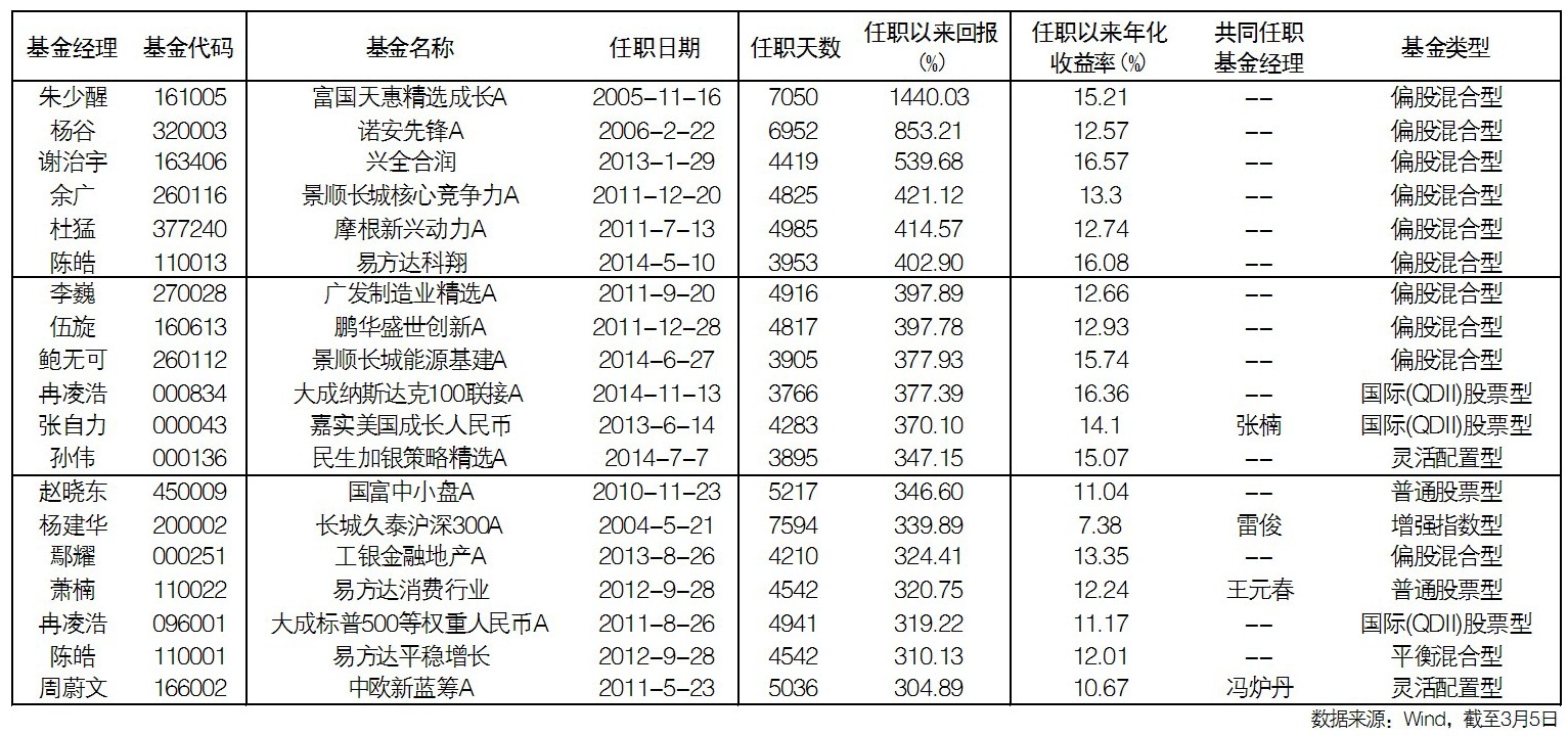 Wind資訊顯示,截至今年3月5日,任職以來所管基金回報率最高的基金經理是朱少醒,高達1440%。朱少醒從2005年11月開始管理富國天惠精選成長,其間經歷多次牛熊更替,他任職以來的年化收益率達到15.21%。此外,諾安先鋒的楊谷、興全合潤的謝治宇、景順長城核心競爭力的余廣、摩根新興動力的杜猛、易方達科翔的陳皓創造了任職以來逾400%的同只基金回報率,任職以來的年化收益率均超過12%(見表)。
