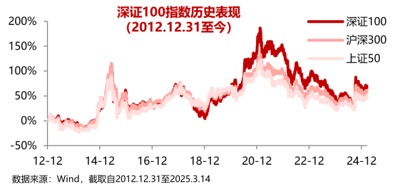數據來源:Wind,國證指數。深證100指數基日為2002.12.31,發布日期為2006.1.24,該指數2020-2024年分年度漲跌幅為:57.70%、-1.27%、-26.13%、-17.36%、11.07%。指數成份股構成根據該指數編制規則適時調整,其回測歷史業績不預示指數未來表現。
