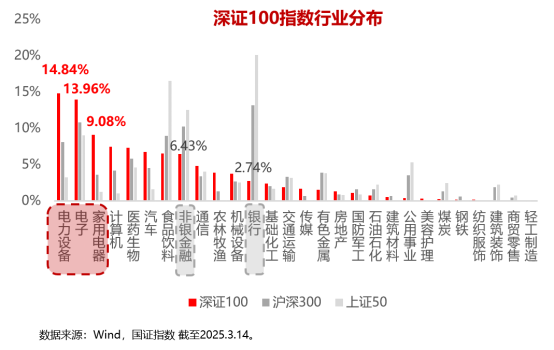 科技創新與提振消費,已成為當前我國經濟發展的關鍵熱詞,亦是A股投資者重點布局的2條投資主線。深證100指數在行業布局上,高度契合科技創新和提振消費這2條經濟發展主線。據Wind、國證指數數據統計,截至2025年3月14日,深證100指數前三大權重行業分別為電力設備(占比14.84%)、電子(占比13.96%)、家用電器(占比9.08%),合計占比37.88%;其第四大和第五大權重行業分別為計算機(占比7.45%)、醫藥生物(占比7.29%),合計占比14.74%;均顯著高于滬深300、上證50等寬基指數。同時,深證100指數在大金融板塊(銀行+非銀金融)占比較低,合計占比僅為9.17%,顯著低于滬深300、上證50等寬基指數。